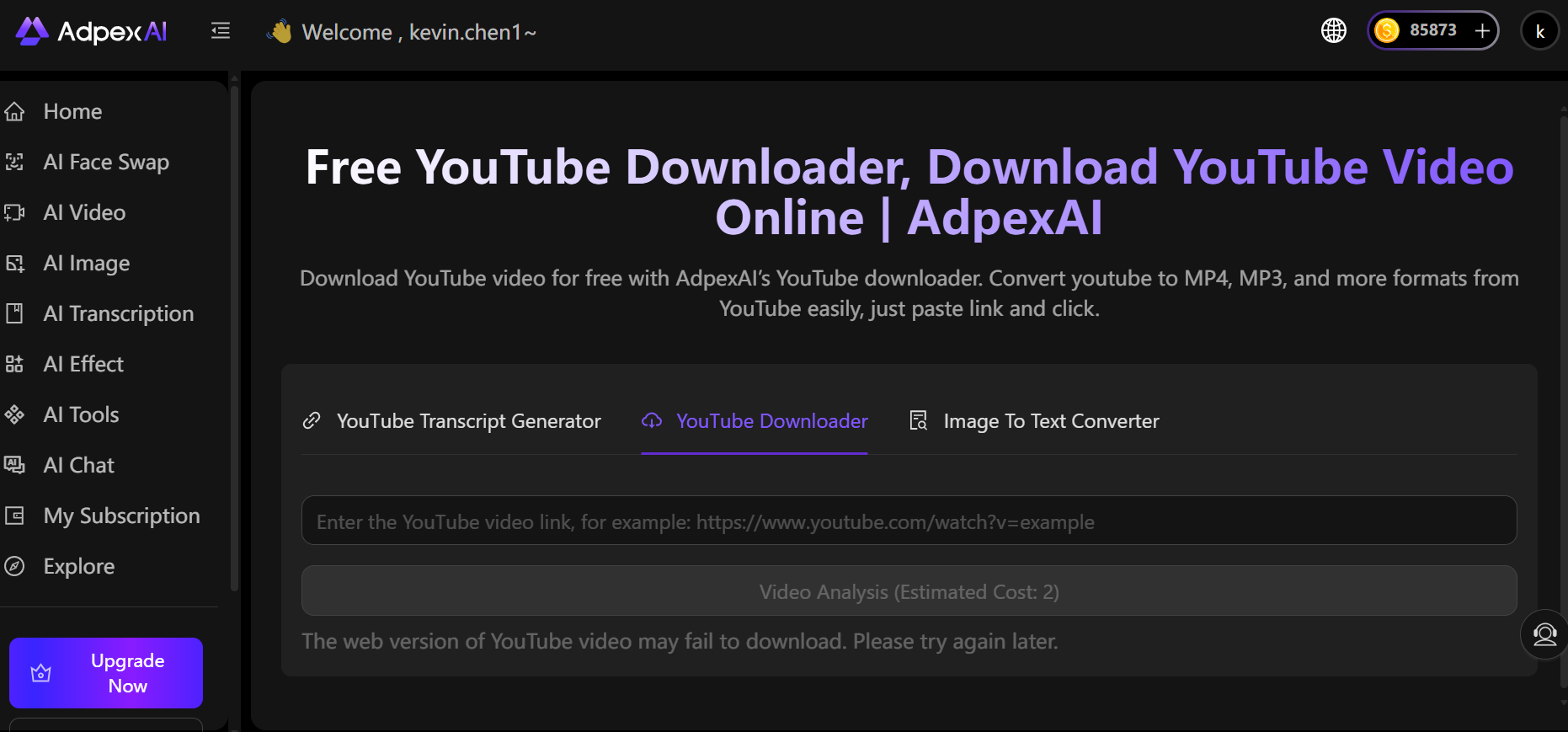 If you prefer not to install anything, AdpexAI is an online alternative that works like an app in your browser. It lets you download a YouTube video instantly without installing traditional software.